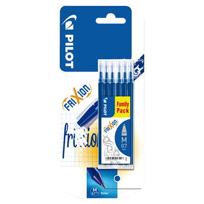 Setul conține 6 rezerve de cerneală albastră, compatibile cu pixurile rollerball PILOT FRIXION cu vârf de 0,7 mm. Cerneala specială este ștergabilă prin frecare, oferind corecturi rapide și curate fără a deteriora hârtia.