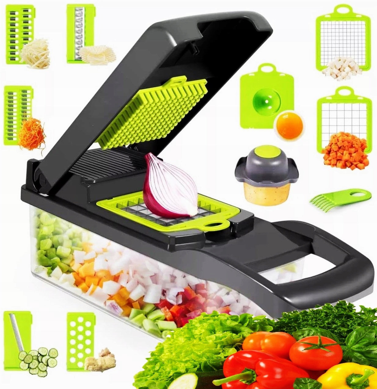 Razătoarea Multifuncțională cu 16 Accesorii este un instrument de bucătărie versatil și indispensabil, ideal pentru pregătirea rapidă și eficientă a alimentelor. Cu un design modern și funcțional, această razătoare oferă multiple posibilități pentru tăierea, felierea și răzuirea legumelor, fructelor și altor ingrediente. Fie că ești un bucătar amator sau un profesionist, această razătoare va deveni rapid un element de nelipsit din bucătăria ta.