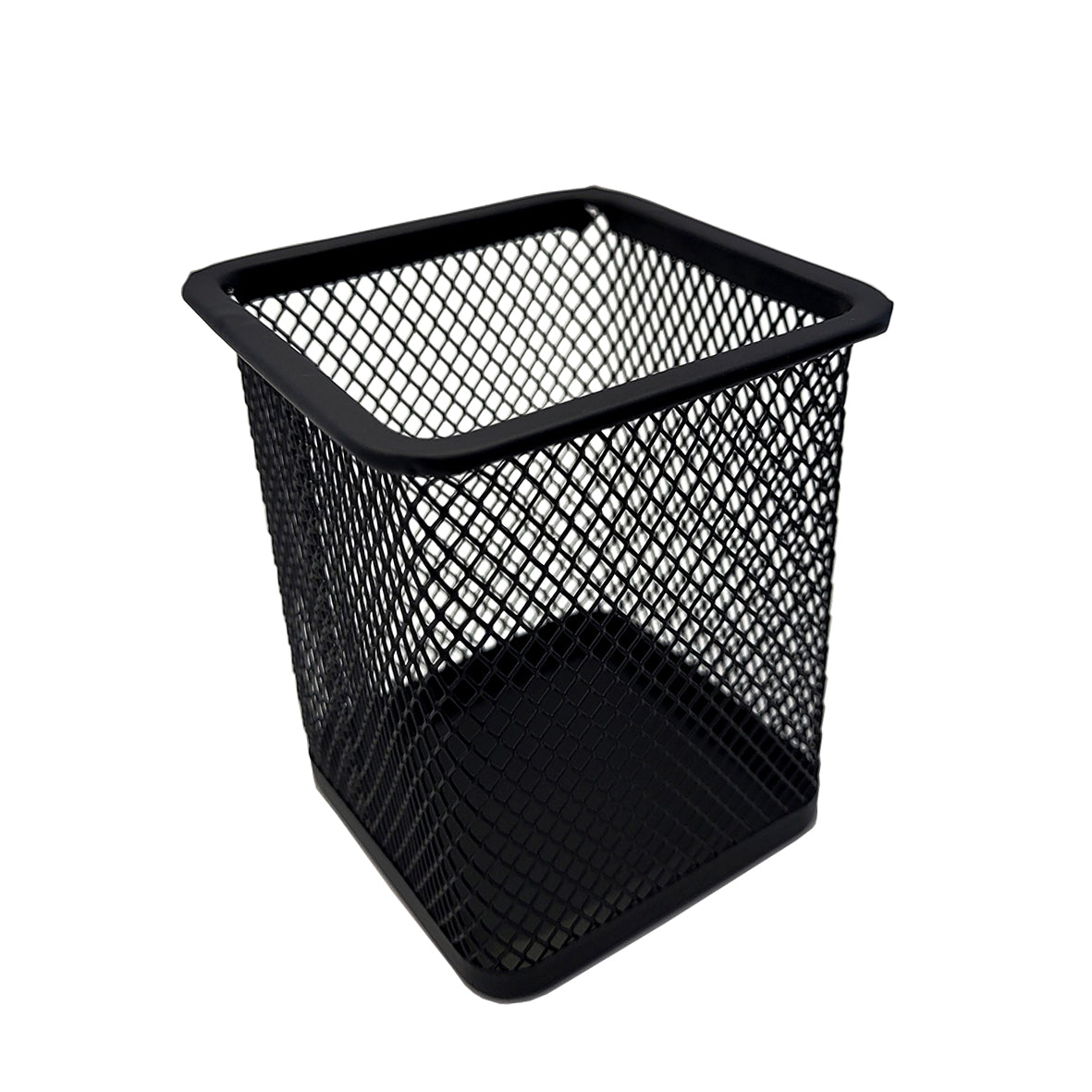 Organizator de birou cu formă pătrată, realizat din metal rezistent, ideal pentru păstrarea ordonată a pixurilor, creioanelor, markere-lor și altor instrumente de scris. Designul metalic perforat oferă un aspect modern și permite o bună vizibilitate a conținutului.