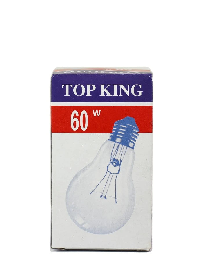 Un bec clasic de tip incandescent de la Top King, cu soclu standard E27, destinat uzului casnic la rețea 220–240 V, oferind o lumină caldă asemănătoare cu cea tradițională, perfectă pentru ambient confortabil.